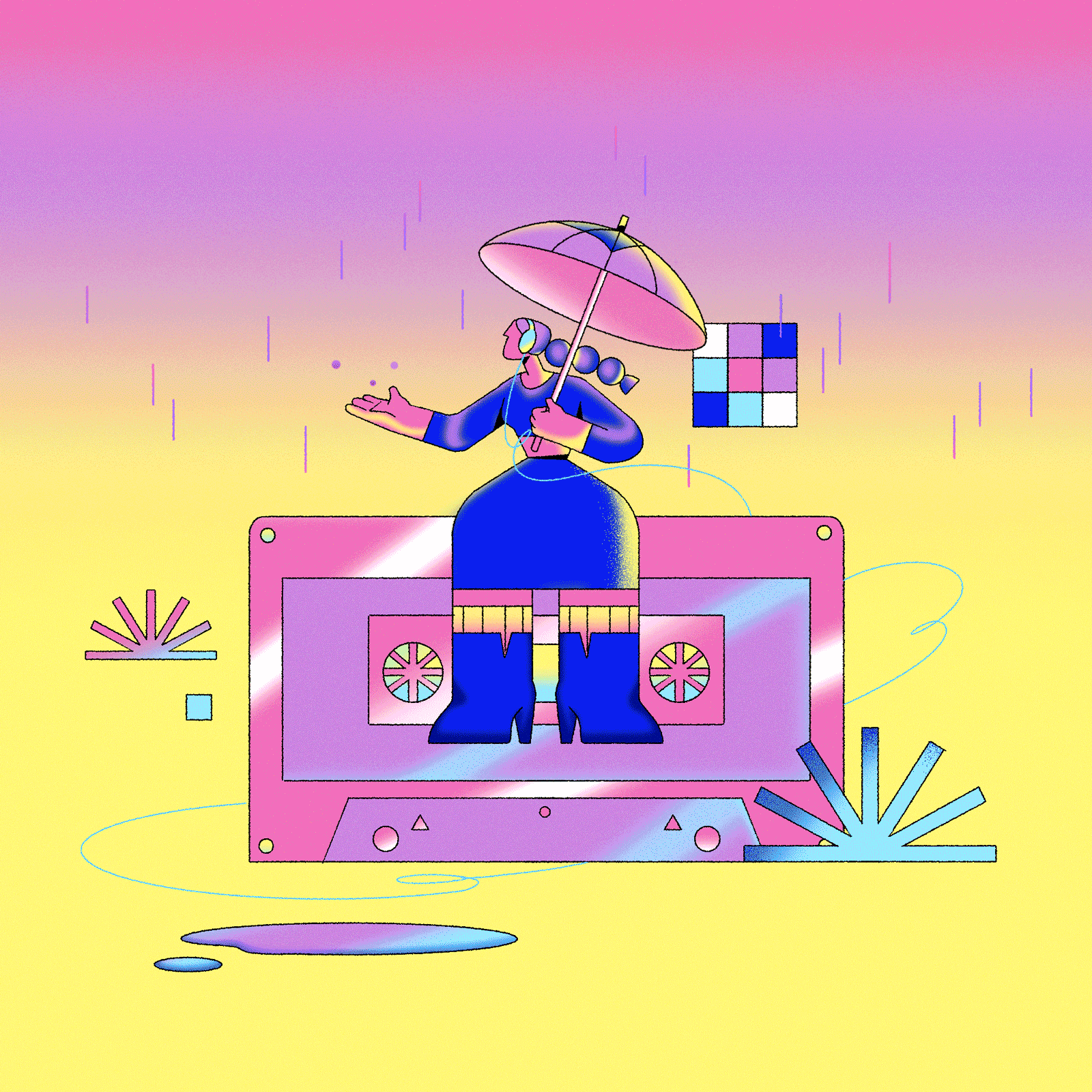 Inquired by Adam and Kristin for their love of 80s rock, these illustrations visually interpret iconic songs with lively characters in neon hues, capturing the vivid essence of the era. In hopes of sharing this dynamic spirit with today’s generation, the work was commissioned to promote the studio.